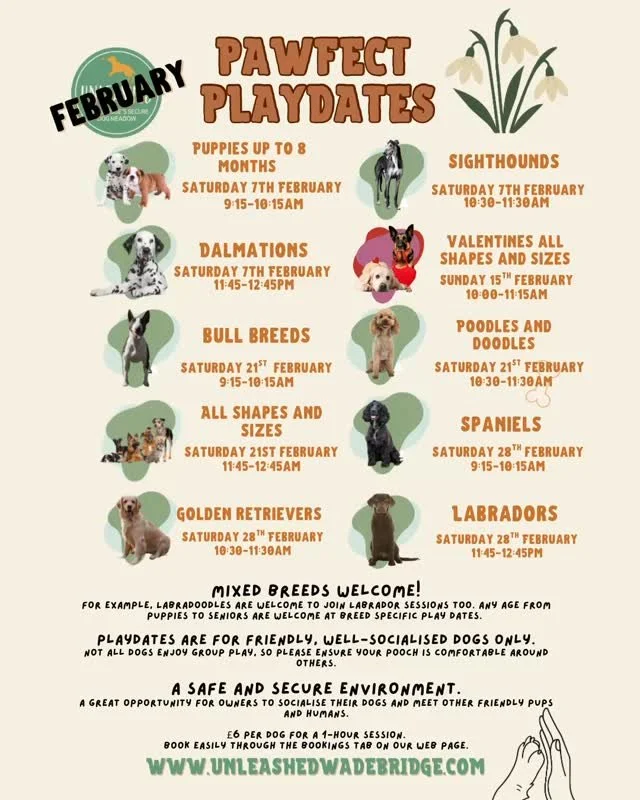 In addition to our exclusive use calendar, we also run Pawfect Playdates at Β£5 per dog within our secure meadow. Our weekly Breed Meet Ups allows opportunity for dogs to mix with dogs of the same breed in a safe and fun environment. Our Pawfect Playdates and parties are for dogs of all shapes and sizes! Book below or via the bookings tab.